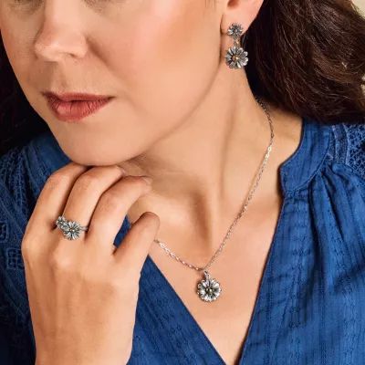 Side-by-side daisy blooms cheerfully adorn this simple ring band. With widespread sterling silver petals and bronze centers, this daisy ring is a beautifully sculpted addition to our collection of florals. The daisy, although the birth month flower for April, actually starts blooming in early summer and continues until the fall. This makes it a flower enjoyed practically year round. Adored by bees, this sunny blossom is often known to represent innocence, new beginnings and cheerfulness. Gift this whimsical ring to anyone to help lift their spirits or help bring a smile to their face. Pair with the rest of the collection: the Blooming Daises Dangle Earrings and Blooming Daisy Charm. RG-2095 Specifications