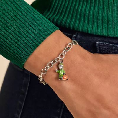 Say “Trick or Treat” to our growing collection of Enamel Halloween Costume Charms. Featuring another timeless dress-up idea, the dinosaur, this charm is hand-enameled with a lime green hue over sterling silver metal. This cute trick-or-treater is carrying a classic orange pumpkin bucket for collecting Halloween goodies. Notice the other intricate details, such as the zipper on the front of the costume and the adorable dino claw feet. Add this nostalgic charm to your fall charm collection. CM-6139-482681 Specifications