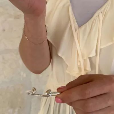 Two hearts joining together in a graceful expression of love and devotion is depicted in this sterling silver heart cuff bracelet. Delicate hearts are outlined to make them more prominent. Engrave initials on the hearts to personalize. Give this bracelet to her as a token of affection for Mother’s Day, anniversary or Valentine’s Day to show the bond between mother and child or a significant other. Stack this heart bracelet with other cuff bracelets to show off your style. Available in three sizes for the best fit. BR-800 Specifications